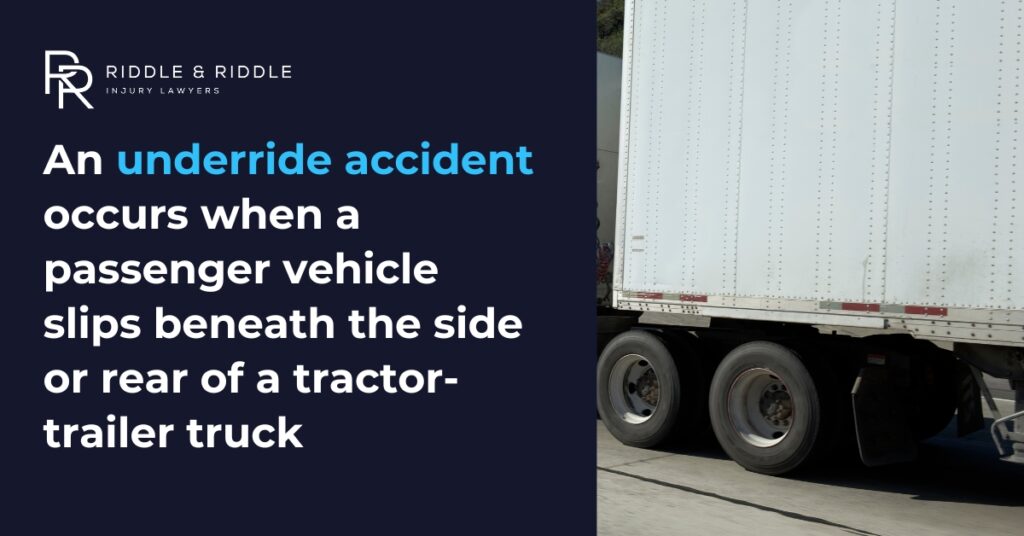 An underride accident is a crash involving a tractor-trailer in which another vehicle gets crushed under the side or back of the tractor-trailer. Large commercial trucks like 18-wheelers are often high enough that a passenger vehicle can slip beneath the trailer, sometimes sheering off the top of the car and resulting in devastating injuries and even death.