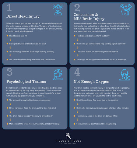 - Memory loss after an accident can result from direct head injury, concussion, oxygen deprivation, or psychological trauma.